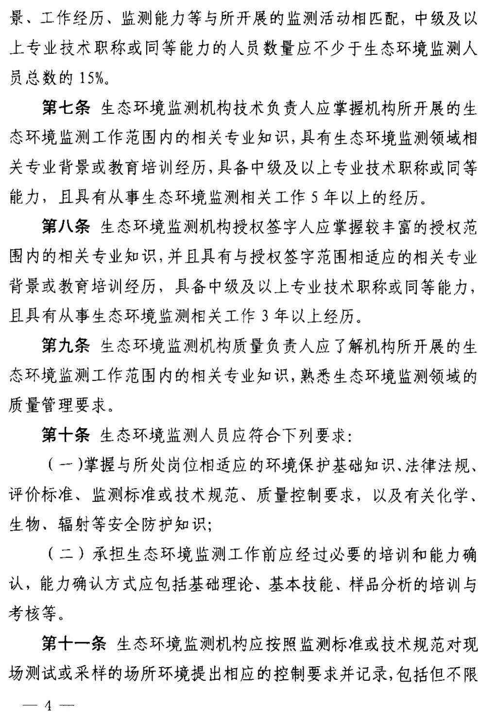 第六條 生態(tài)環(huán)境監(jiān)測(cè)機(jī)構(gòu)應(yīng)保證人員數(shù)量、及其專業(yè)技術(shù)背景、工作經(jīng)歷、監(jiān)測(cè)能力等與所開(kāi)展的監(jiān)測(cè)活動(dòng)相匹配,中級(jí)及以上專業(yè)技術(shù)職稱或同等能力的人員數(shù)量應(yīng)不少于生態(tài)環(huán)境監(jiān)測(cè)人員總數(shù)的15%。